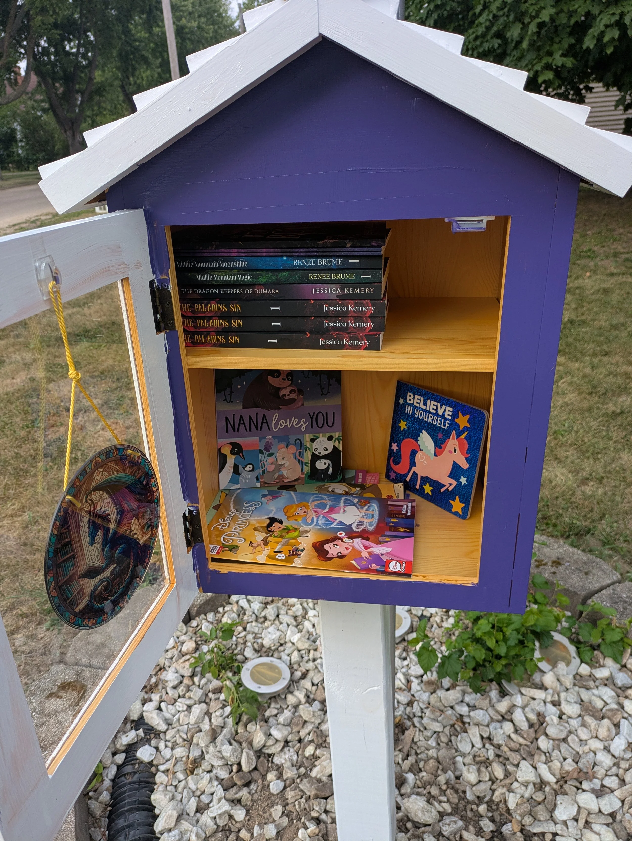 If you would like to feed . . . I mean donate . . . to the always hungry bookwyrm, feel free to leave books in the purple donation bin on the porch.